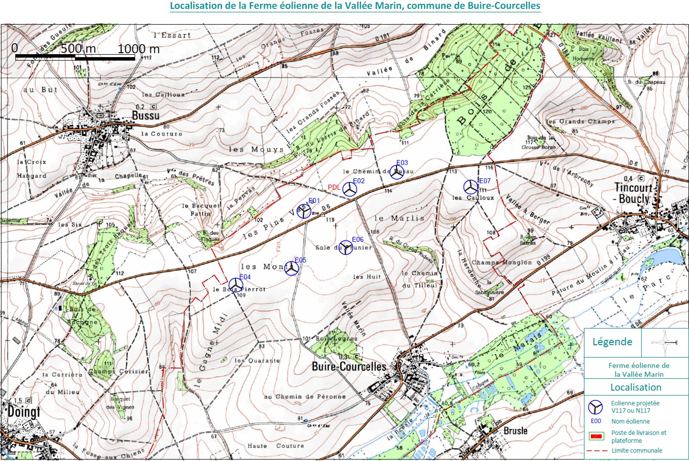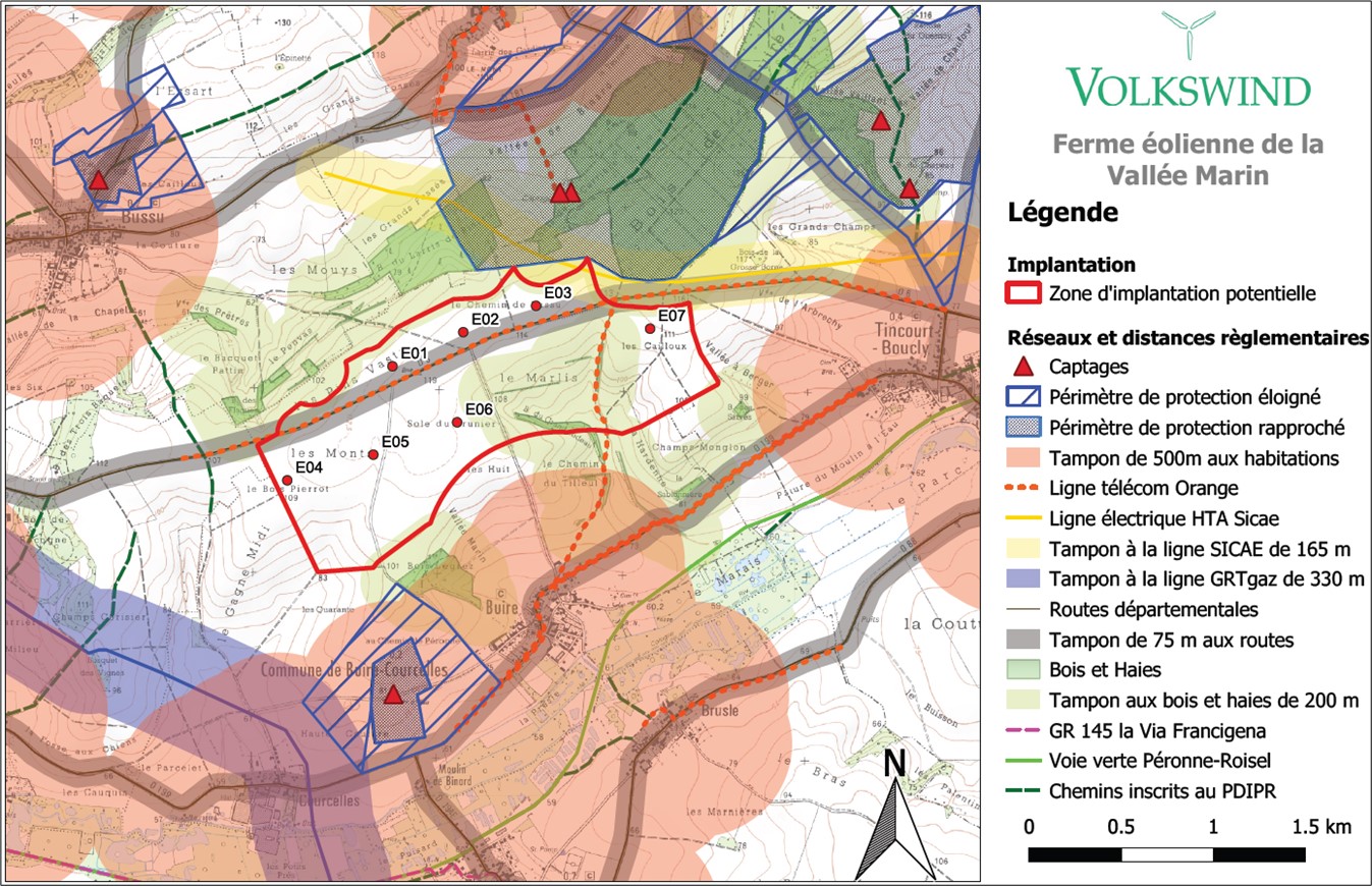 Le projet éolien de la Vallée Marin est situé sur la commune de Buire Courcelles. Ce projet se situe de part et d’autre de la départementale 6.